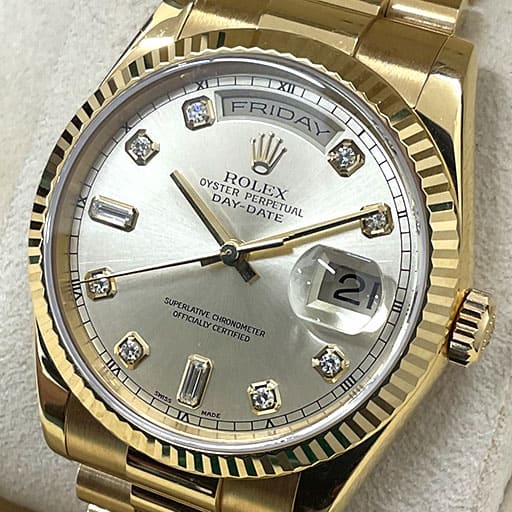 大黒屋 買取 > ロレックス買取 > デイデイト買取 デイデイト買取なら高価買取の大黒屋へ お持ちのデイデイトの買取価格がわかる! 買取強化中のデイデイトはこちら 買取価格には自信があります!だから大黒屋へは「最後」にお問い合わせください! デイデイト18238A デイデイト228206 デイデイト18038A デイデイト118238A 時計の売却方法 家から出ないで手続終了宅配買取 即日その場で現金化店頭買取 自宅へ査定員がお伺いします出張買取 ※店舗へのお持込みの際は店舗毎に買取条件等が異なりますので、直接各店までお問い合わせください。 フリーワード検索 絞り込み検索 すべての{{ selectbox1Label }} {{ select1.name }} ({{ select1.count }}) すべての{{ selectbox2Label }} {{ select2.name }} ({{ select2.count }}) すべての{{ selectbox3Label }} {{ select3.name }} ({{ select3.count }}) 検索条件をクリア 大黒屋のデイデイト買取実績こちらは買取日時点での大黒屋店頭または宅配、出張での買取実績となります。同一商品であっても、状態や保証書・付属品の有無、各店舗の取扱状況などによって買取価格は変わる場合がございます。お持込み予定の店舗へご連絡いただければ、お品物の状態等を確認させていただき、実際の買取額に近い価格をお伝えできますので、お気軽にお問合せください。 2026年3月16日 ロレックスデイデイト 18238A 買取参考価格 2,600,000円 2026年2月28日 ロレックスデイデイト 118238A 買取参考価格 2,750,000円 2026年2月25日 ロレックスデイデイト トリドール 18239A BIC 買取参考価格 2,600,000円 2026年2月23日 ロレックスデイデイト 118239A 買取参考価格 3,130,000円 2026年2月17日 ロレックスデイデイト 118238A 買取参考価格 2,900,000円 2026年2月17日 ロレックスデイデイト 36 128238A 買取参考価格 7,105,000円 2026年2月13日 ロレックスデイデイト 1803/9 買取参考価格 1,000,000円 2026年2月13日 ロレックスデイデイト 18238A 買取参考価格 2,300,000円 もっと見る 最新の査定目安額を知りたい方は お電話一本で丁寧にご対応します! 0120-188-153 電話受付 10:00~18:00 タップすると電話がかかります お電話一本で丁寧にご対応します! 0120-188-153 電話受付 10:00~18:00 最短1分で回答いたします! 最短1分で回答いたします! かんたんLINE査定 写真を送るだけでお試し査定 ご相談・手続きすべて無料 査定目安金額をお伝えします ご売却までの流れを説明します ▼すぐに送りたい場合はこちら▼ その他デイデイト買取実績 デイデイト買取対象モデル 未使用品 未使用品 買取価格の条件 ・最新の保証書で日付が1か月以内 ・付属品が全て揃っている ・当社規定に基づき未使用と判断できる状態のもの 中古品 中古品 買取価格の条件 ・保証書が無記載ではなく、最新の保証書で日付が6か月以内 ・ボックス、保証書、コマ、その他付属品について年式相応のものが全て揃っている ・ガラス、ケース、ブレスレットなどに目立った傷や打痕等が無い ・バックル、リューズに損傷が無く、正常に機能している ※上記に該当しないものでもお気軽にお問い合わせください。 更新日:2026年3月19日 モデル名 型番未使用品買取価格中古品買取価格デイデイト40 PT アイスブルー ダイヤ228206Aお問い合わせお問い合わせデイデイト40 RG オリーブグリーン228235お問い合わせお問い合わせデイデイト40 RG チョコレート228235お問い合わせお問い合わせデイデイト40 YG ブラック228238お問い合わせお問い合わせデイデイト40 WG ブルー228239お問い合わせお問い合わせデイデイト40 YG ベゼルダイヤ228348RBRお問い合わせお問い合わせデイデイト36 YG グリーンオンブレ128238Aお問い合わせお問い合わせデイデイト36 WG ブルーオンブレ128239Aお問い合わせお問い合わせデイデイト36 YG ベゼルダイヤ118348お問い合わせお問い合わせデイデイト36 YG ベゼルダイヤ118348お問い合わせお問い合わせデイデイト YG18038お問い合わせお問い合わせデイデイト YG ダイヤ18038Aお問い合わせお問い合わせデイデイト YG ベゼルダイヤ18048Aお問い合わせお問い合わせデイデイト YG18238お問い合わせお問い合わせデイデイト YG 旧ダイヤ留め18238Aお問い合わせお問い合わせデイデイト YG 新ダイヤ留め18238Aお問い合わせお問い合わせデイデイト YG ベゼルダイヤ18348Aお問い合わせお問い合わせデイデイト YG118238お問い合わせお問い合わせデイデイト YG ダイヤ118238Aお問い合わせお問い合わせデイデイト ベゼルダイヤ118348Aお問い合わせお問い合わせデイデイト WG18039お問い合わせお問い合わせデイデイト WG ダイヤ18039Aお問い合わせお問い合わせデイデイト WG ベゼルダイヤ18049Aお問い合わせお問い合わせデイデイト WG18239お問い合わせお問い合わせデイデイト WG 旧ダイヤ留め18239Aお問い合わせお問い合わせデイデイト WG 新ダイヤ留め18239Aお問い合わせお問い合わせデイデイト WG ベゼルダイヤ18349Aお問い合わせお問い合わせデイデイト WG118239お問い合わせお問い合わせデイデイト WG ベゼルダイヤ118239Aお問い合わせお問い合わせデイデイト RG118235お問い合わせお問い合わせデイデイト RG ダイヤ118235Aお問い合