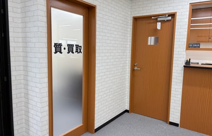 店内には個室の査定ブースがございます。椅子は2脚ございますので、お連れ様がいる場合でもご利用いただけます。同フロアにはトイレもございます。