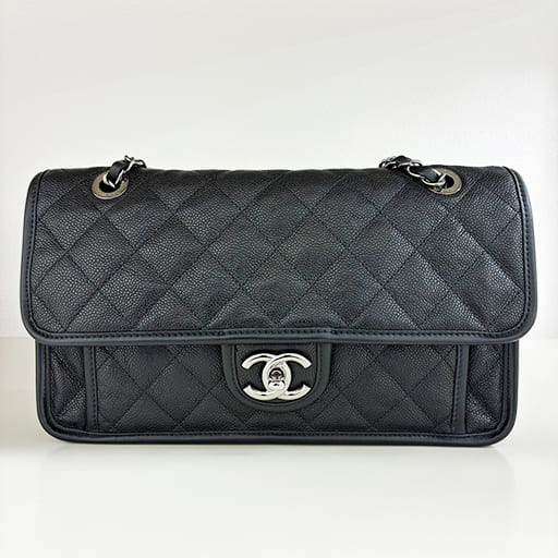 シャネル フレンチリビエラ チェーンショルダーバッグ A66801 マトラッセ ブラック キャビア シルバー金具