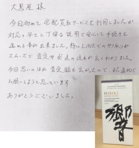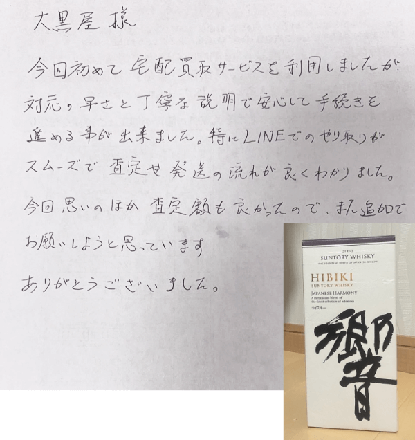 大黒屋 買取 > お酒買取 > 検索結果 お酒の買取なら年間買取150万件、全国280店舗の大黒屋 フリーワード カテゴリ検索 すべての{{ selectbox1Label }} {{ select1.name }} ({{ select1.count }}) すべての{{ selectbox2Label }} {{ select2.name }} ({{ select2.count }}) すべての{{ selectbox3Label }} {{ select3.name }} ({{ select3.count }}) 検索条件をクリア loading... 宅配買取 店頭買取 ご注意下さい! 当価格表は「宅配買取での金額目安」となり、大黒屋各店の店頭買取とは買取金額が異なる場合がございます。 ※箱・付属品の有無やボトルの状態(キズ汚れ等)によって買取価格が変わります。 ※買取目安金額が合計5,000円以上のお品物が宅配買取サービスの対象となります。合計5,000円未満のお品物もしくは店頭買取をご希望の場合は、お手数ですが直接各店舗までお問合せください。 ※買取価格は市場価格変動や弊社在庫等により常に変動しており、「宅配買取」ご利用の際の買取価格はお客様発送日・お問合せ日ではなく、弊社商品到着日・確認日での買取価格となります。 「店頭買取」も同様にお持込みいただいた時点での買取価格となりますので、予めご了承下さい。 お酒の売却方法 家から出ないで手続終了宅配買取 即日その場で現金化店頭買取 自宅へ査定員がお伺いします出張買取 ※当店では各商材の価格変動に応じて買取価格が変動する場合がございます。最新情報はお問い合わせください。 大黒屋のお酒買取実績こちらは買取日時点での大黒屋店頭または宅配、出張での買取実績となります。同一商品であっても、状態や保証書・付属品の有無、各店舗の取扱状況などによって買取価格は変わる場合がございます。お持込み予定の店舗へご連絡いただければ、お品物の状態等を確認させていただき、実際の買取額に近い価格をお伝えできますので、お気軽にお問合せください。 2026年4月26日 ドメーヌ・アルマン・ルソークロ・ド・ラ・ロッシュ・グランクリュ 2014 買取参考価格 70,000円 2026年4月26日 ドンペリニヨン吉岡徳仁 ヴィンテージ 2009 箱付 買取参考価格 25,000円 2026年4月26日 スプリングバンク21年 キャンベルタウン シングルモルト 箱付 買取参考価格 100,000円 2026年4月26日 レミーマルタンルイ13世 シェル型箱 バカラボトル 冊子付 買取参考価格 125,000円 もっと見る 最新の査定目安額を知りたい方は お電話一本で丁寧にご対応します! 0120-188-300 電話受付 10:00~18:00 タップすると電話がかかります お電話一本で丁寧にご対応します! 0120-188-300 電話受付 10:00~18:00 最短1分で回答いたします! 最短1分で回答いたします! かんたんLINE査定 写真を送るだけでお試し査定 ご相談・手続きすべて無料 査定目安金額をお伝えします ご売却までの流れを説明します ▼すぐに送りたい場合はこちら▼ お酒買取のお客様の声 実際に大黒屋の宅配買取をご利用になられたお客様の感想をご覧いただけます!大黒屋では買取されたお客様の声をお送りいただくと、全員に500円のクオカードプレゼントキャンペーンを実施しております! 鳥取県鳥取市 A様 男性 酒 ウイスキー 響ジャパニーズハーモニーなど5点大黒屋様 今回初めて宅配買取サービスを利用しましたが、対応の早さと丁寧な説明で安心して手続きを進める事が出来ました。 特にLINEでのやり取りがスムーズで、査定や発送の流れが良くわかりました。 今回思いのほか査定額も良かったので、また追加でお願いしようと思っています。 ありがとうございました。東京都渋谷区 I様 男性 酒 ワイン DRCグランエシェゾー2002高額ワインを高評価ありがとうございました。 オールドビンテージウイスキーとかもありますので、またお願いします。埼玉県幸手市 M様 女性 酒 シャンパン ドンペリニヨン ロゼこの度、初めて大黒屋さんを利用しました。 父から譲られたお酒の処分に困っていました。 買い取りしてくれる所があるのかも不安でしたが、ネットで調べたところ何社かヒットしました。 ネットで調べる前に下取りをしている知人に聞いた時はあまりにも安値でガッカリしました。 そこで、取りあえずネットでヒットした、いくつかの会社にも査定してもらったところ、その中でも一番の高値を出してくれたのが大黒屋さんでした。 知人から聞いた値の倍近い査定だったので、お願いしてみようと思いました。 買取対象のお酒 ウイスキー ブランデー ワイン シャンパン 日本酒 焼酎 その他のお酒 お酒買取強化銘柄 山崎YAMAZAKI 響HIBIKI 白州HAKUSHU 竹鶴TAKETSURU 余市YOICHI 宮城峡MIYAGIKYO 軽井沢KARUIZAWA イチローズモルトIchiro's Malt マッカランMACALLAN ボウモアBOWMORE レミーマルタンREMY MARTIN ヘネシーHennessy カミュCAMUS ロマネコンティRomanee-Conti モンラッシェMONTRACHET シャトーペトリュスCHATEAU PETRVS シャトーラフィットLAFITE ROTHSCHILD シャトームートンMOUTON ROTHSCHILD オーパスワンOPUS ONE ドンペリDon Perignon アルマンドブリニャックARMAND DE BRIGNAC クリュッグKRUG 十四代JUYONDAI 森伊蔵MORIIZO 貴州茅台酒KWEICHOW MOUTAI その他、下記銘柄も買取強化しております。 アード