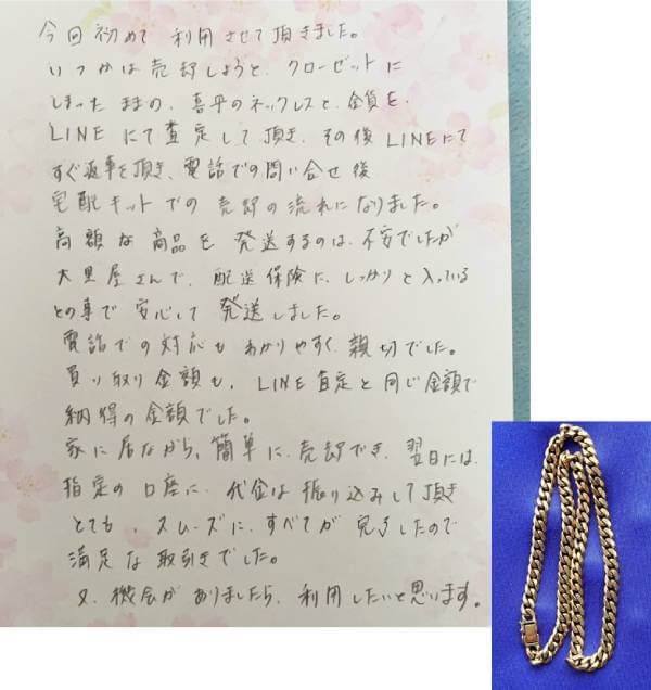いつかは売却しようと、クローゼットにしまったままの、喜平のネックレスと金貨を、LINEにて査定して頂き、その後LINEにてすぐ返事を頂き、電話での問い合わせ後宅配キットでの売却の流れになりました。