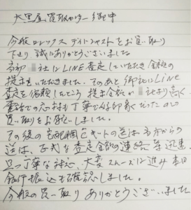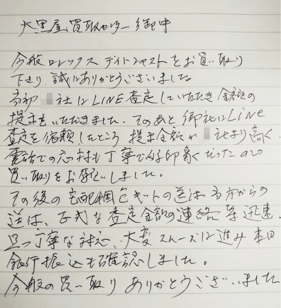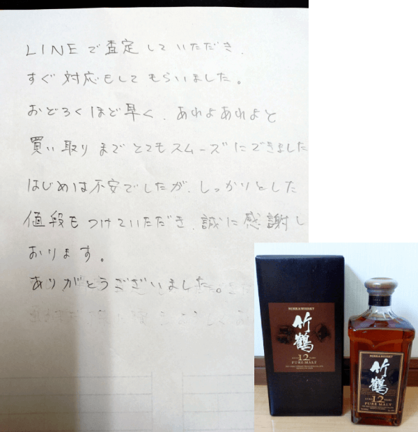 そのあと御社にLine査定を依頼したところ提示金額が○社より高く、電話での応対も丁寧で好印象だったので買い取りをお願いしました。