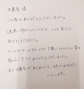 実際に大黒屋の宅配買取・出張買取をご利用になられたお客様の感想をご覧いただけます!大黒屋では買取されたお客様の声をお送りいただくと、全員に500円のクオカードプレゼントキャンペーンを実施しております!